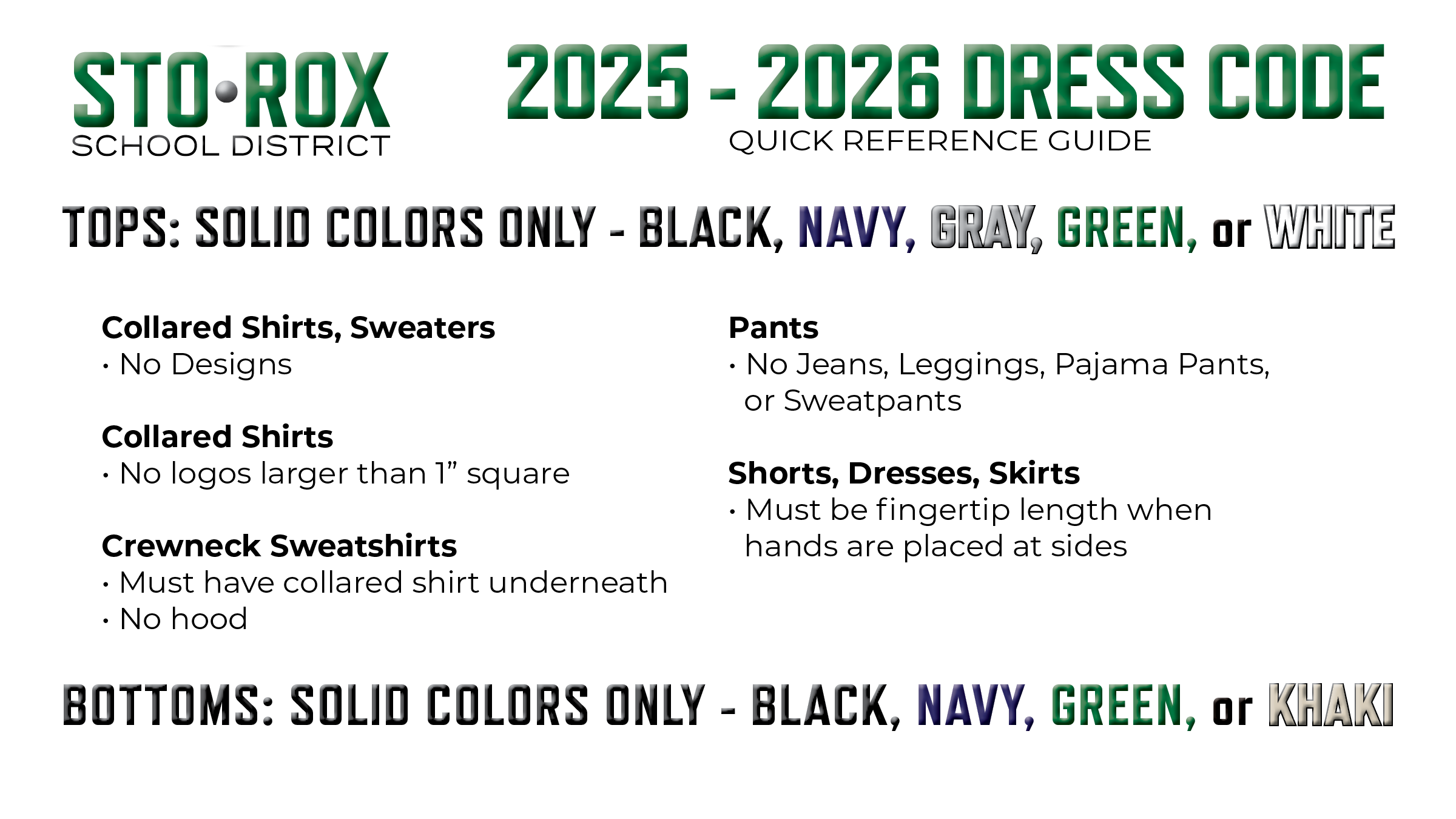UPDATE, 9/19/25: The Sto-Rox dress code has been updated to include navy as an approved color option. Families may now purchase tops and bottoms in navy, in addition to the other approved dress code colors.