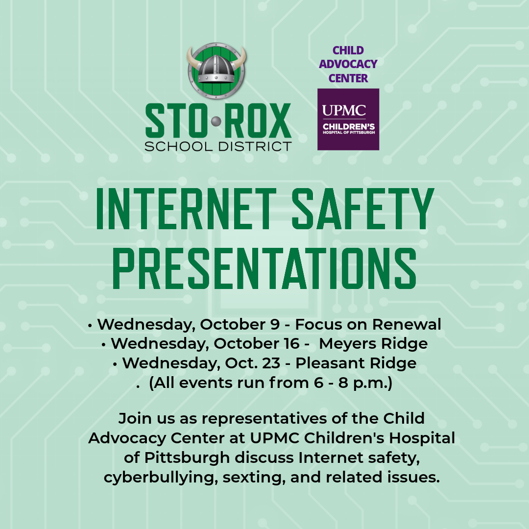 Sto-Rox School District the Child Advocacy Center at UPMC Children’s Hospital of Pittsburgh are teaming up to present information to the community, including Sto-Rox parents and guardians, about Internet safety, cyberbullying, sexting, and related issues. Three presentations, all running from 6-8 p.m., are scheduled in the Sto-Rox community: