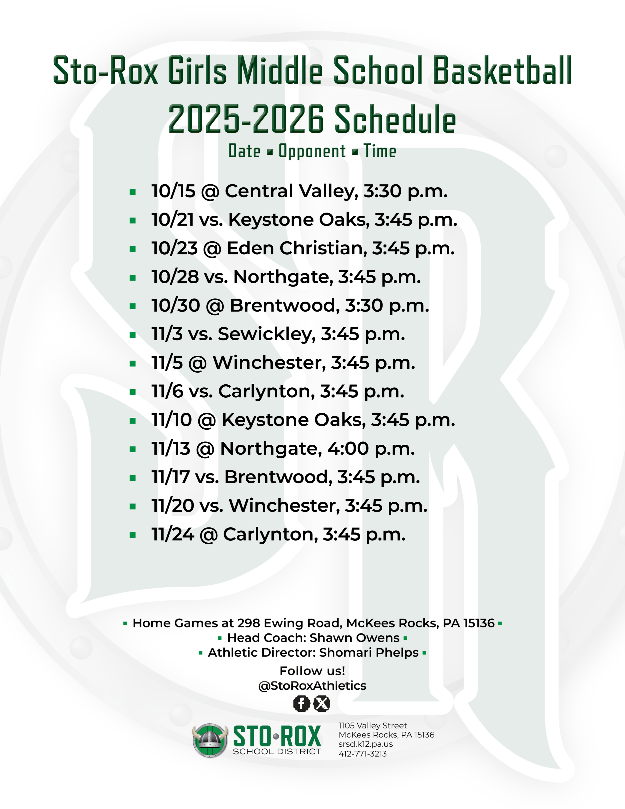 • All home games at the Sto-Rox Upper Elementary School (298 Ewing Road, McKees Rocks, PA 15136).