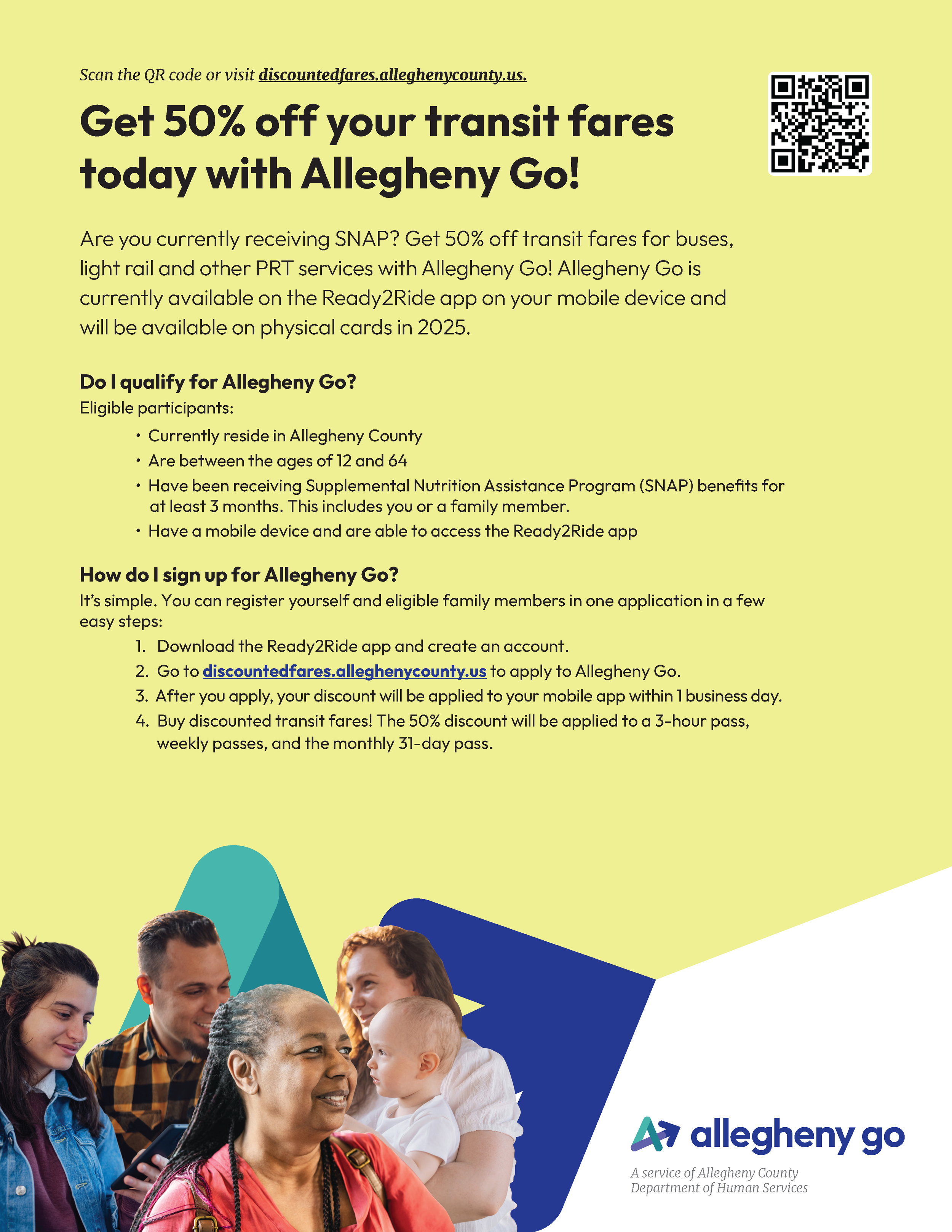 Starting Monday, June 3 current Allegheny County residents between the ages of 12 and 64, who have received SNAP benefits for the last three months, are eligible for a 50% discount and are encouraged to apply. You must have a mobile device and access to the Ready2Ride app. Check out the flyer at right, or download it at the link below, to learn more about Allegheny Go.