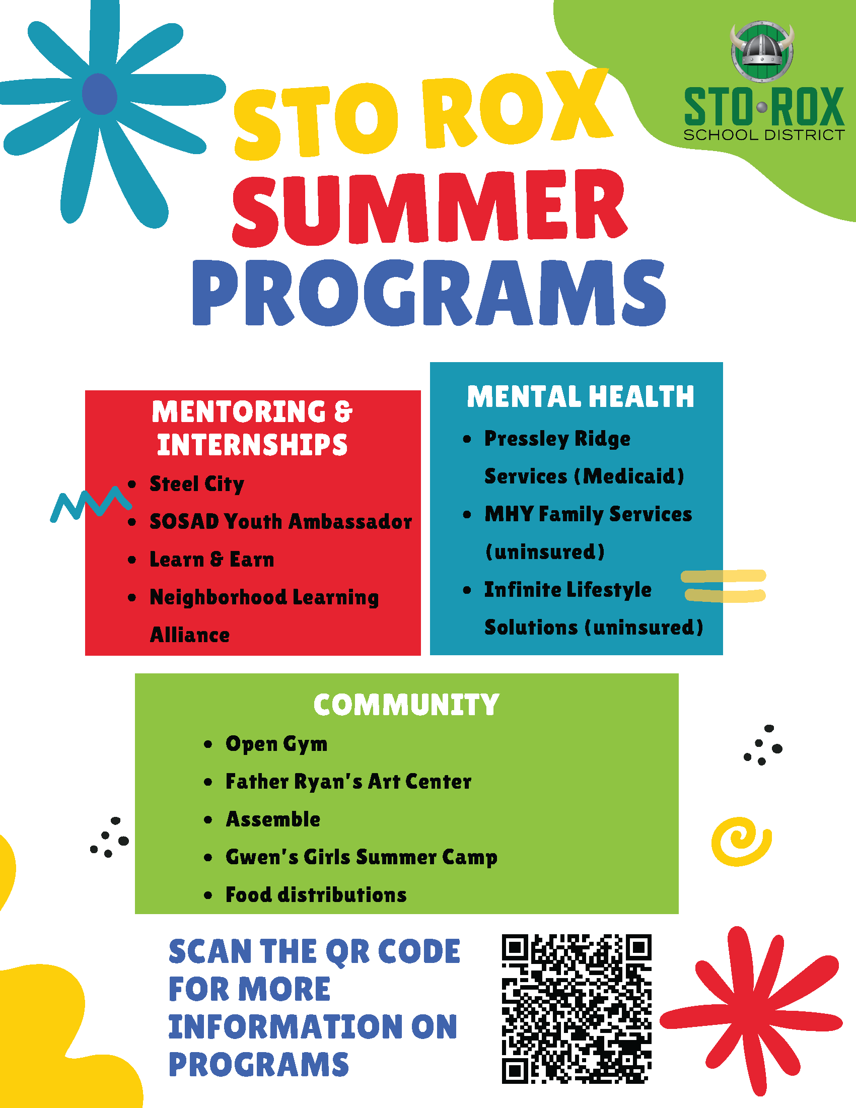 Now that the 2024-25 school year is over and summer break has arrived, special programming is getting started in Sto-Rox. Please review the 2025 Sto-Rox Summer Programming Guide, organized by district social worker and therapist Alex Gariepy. This guide includes information on our summer programming providers, from Steel City Impact to Focus on Renewal and everyone in between.