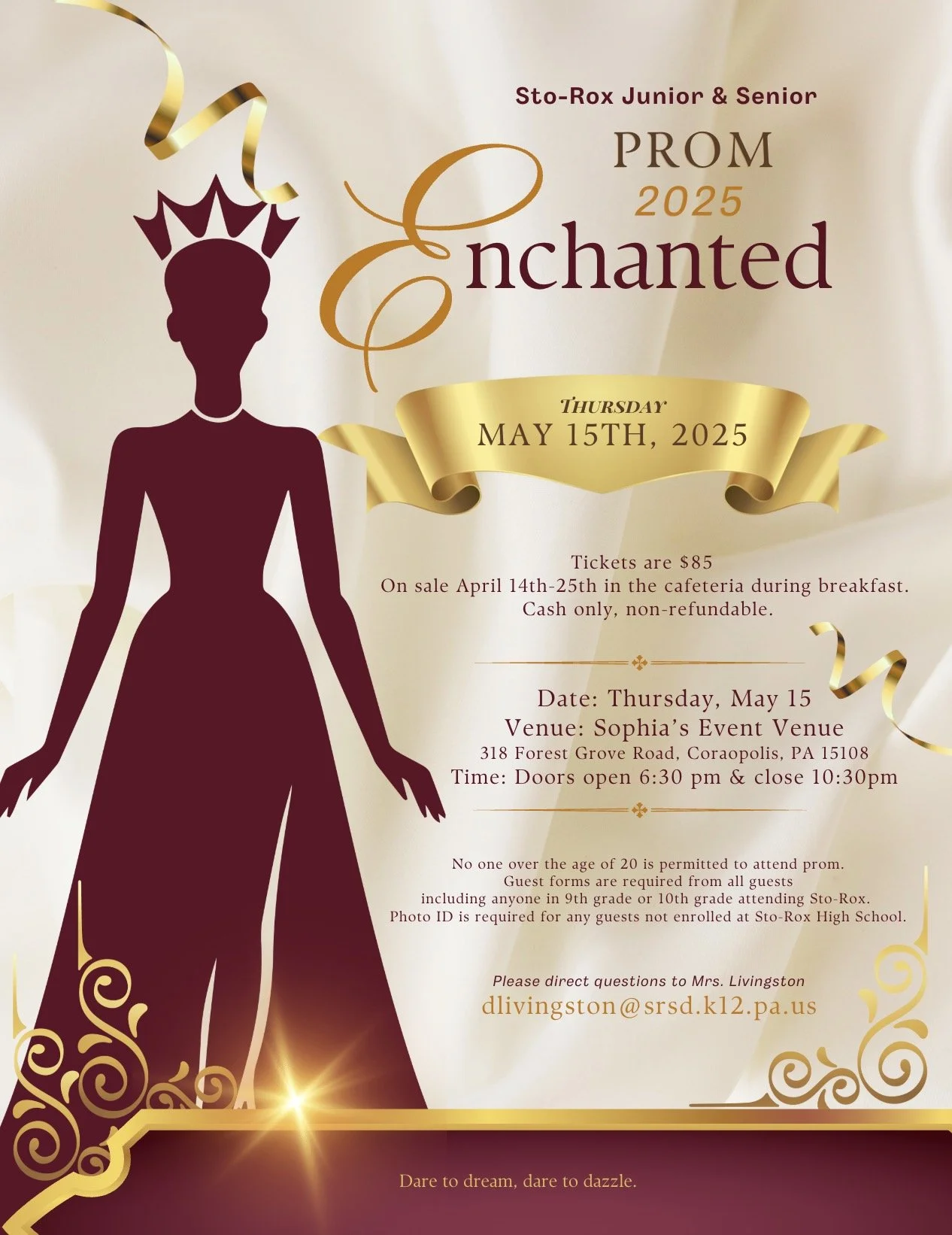 UPDATE, 3/19/25: “Enchanted” is the theme of the 2025 Sto-Rox Jr./Sr. High School Prom! Tickets will go on sale from April 14 - 25 in the cafeteria during breakfast. Tickets are $85 apiece and non-refundable. Cash only please! Prom will take place at Sophia’s in Coraopolis from 6:30 - 10:30 p.m. on Thursday, May 15. Download the complete flyer for more details.