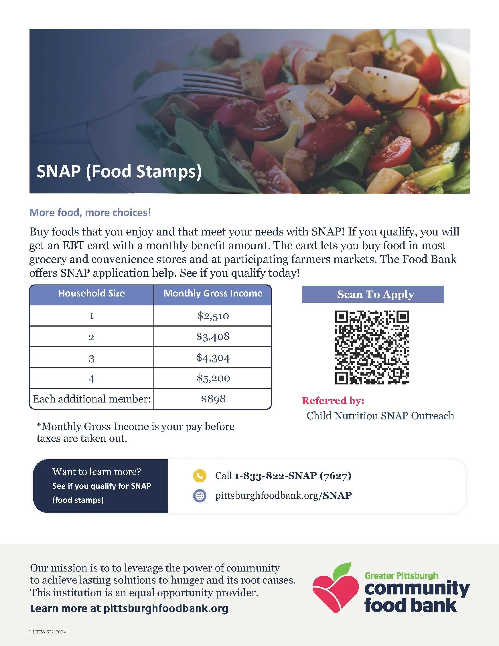 If you’d like to learn more or find out if your family qualifies, call 1-833-822-SNAP (7627) or visit pittsburghfoodbank.org/SNAP