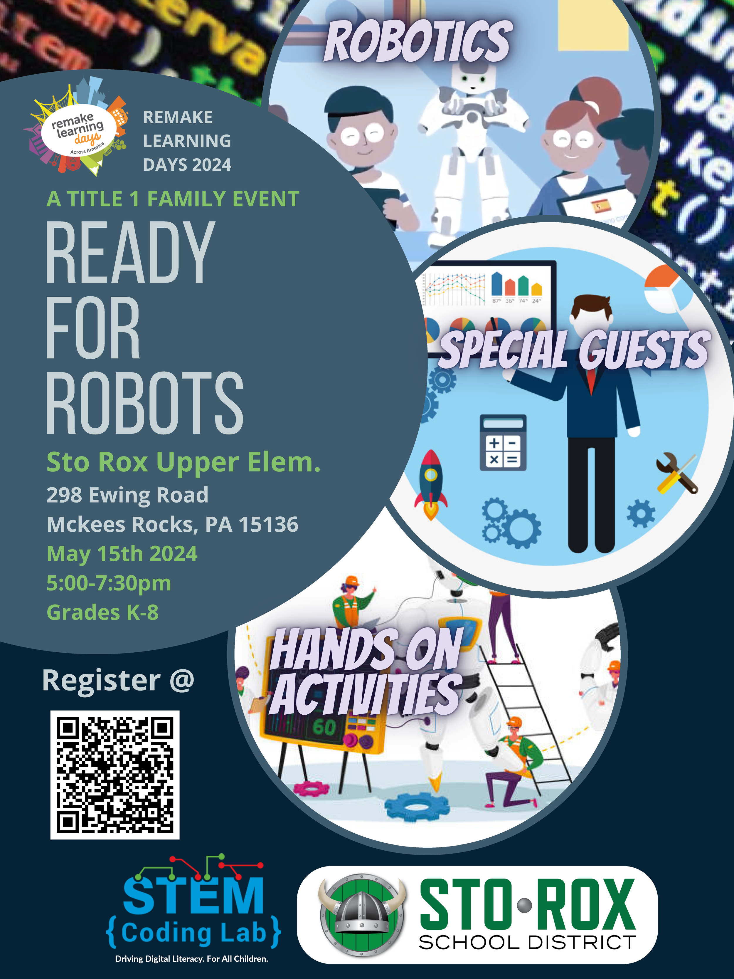ORIGINAL POST, 5/3/24: Sto-Rox School District is proud to be part of Remake Learning Days 2024! The district will host a Title I Event on Wednesday, May 15 at Sto-Rox Upper Elementary from 5 - 7:30 p.m. The district has partnered with STEM Coding Lab to provide robotics-related activities for children in grades K-8. Children and families will be able to learn about computer science from Google employees and engage in digital literacy activities. We hope you can join us! You can register for this free event at the link below.